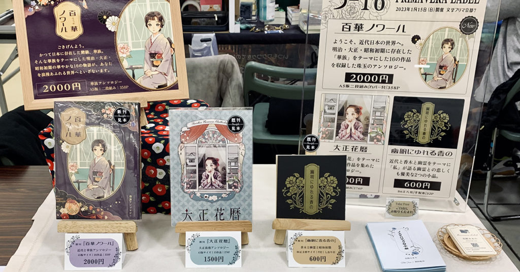 つい一週間前に文学フリマ京都があったなんて、まるで嘘のようですね!時間が経つのは早いもので、瞬く間に過ぎていくので後々にしないようにしたいものです。(訳:ブログは早めに書くが吉) さて、人生で初めて参加したイベントが文学フリマ京都だっためか思い入れの強い1月のイベント。今回はなんといっても華族アンソロジー『百華ノワール』の初頒布がありました。